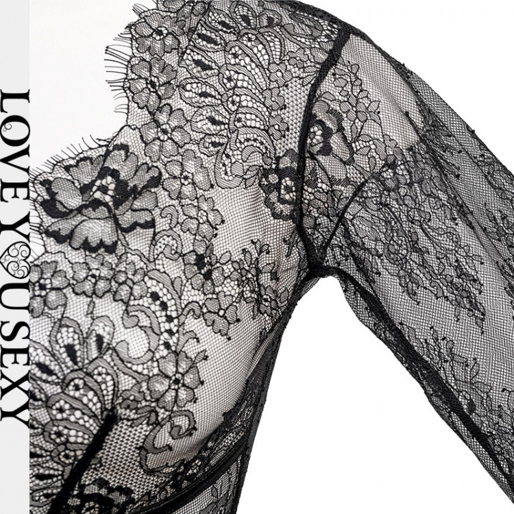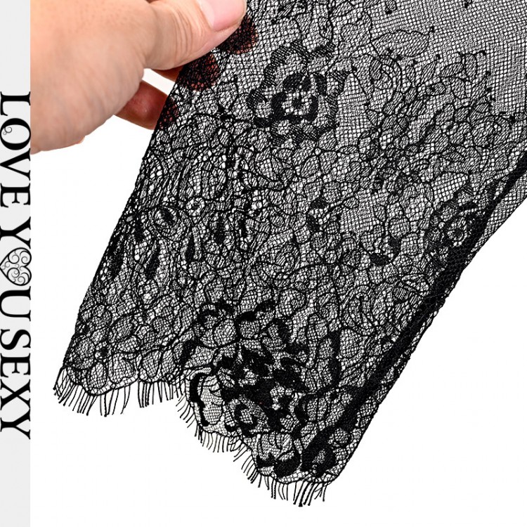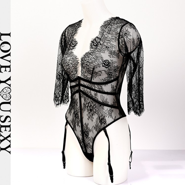 Middle long sleeves Eye-lash lace bodysuit with high cut bottom matching with garter belts, front deep V open and bottom U shape open design, Sexy lines under the bras detail made the full piece Super Sexy